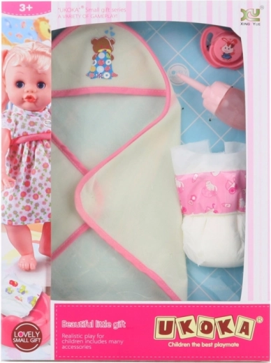 A 30 cm-es babákhoz készült praktikus kiegészítőkészlet minden kis gondoskodót örömmel tölt el. Tartalmaz egy textil pólyát, egy műanyag cumit, egy műanyag cumisüveget és egy pelenkát – mindent, ami a babázáshoz szükséges. Ideális ajándék 3 éves kortól.