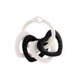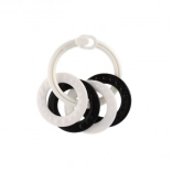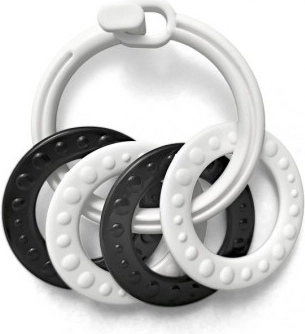 Stílusos fekete–fehér gyűrűszett négy formával – ideális első játék babáknak. A kontrasztos minták támogatják a vizuális stimulációt, a változatos felületek fejlesztik a tapintást, a könnyű kialakítás pedig megkönnyíti a fogást a kis kezek számára. Alkalmas újszülöttkortól.