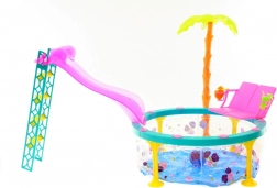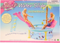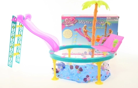 Glorie medence csúszdával ideális játék a kisgyermekek számára, akik szeretnek babákkal játszani. Ez a készlet mindent tartalmaz, amire szükség van egy szórakoztató fürdőzéshez és csúszkáláshoz.