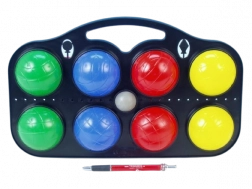 Nyolc darab műanyag petanque golyó készlete, amely ideális szórakoztató kültéri tevékenységekhez. Minden golyónak egyedi színe van a könnyű azonosítás érdekében a játék során. A készlet praktikus csomagolásban érkezik, amely megkönnyíti a tárolást és az iskolai golyók szállítását.