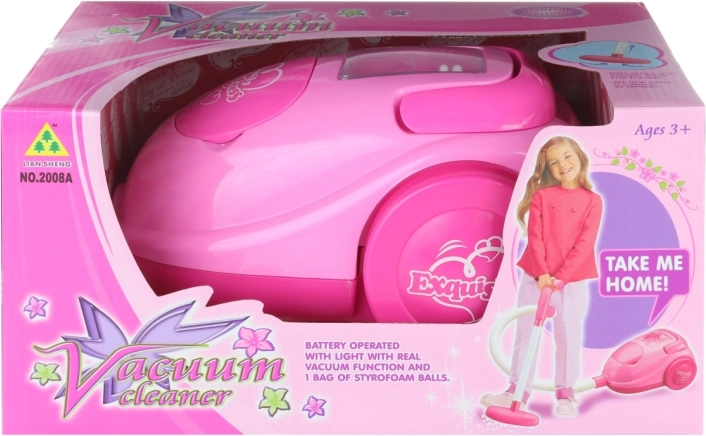 Rózsaszín elemes gyerekporszívó hangokkal és működő golyószívással. Könnyű és biztonságos, 3 éves kortól ideális. Tápellátás: 4× AA, elemek nélkül.