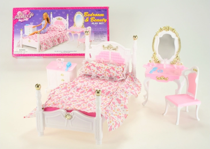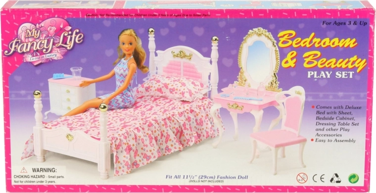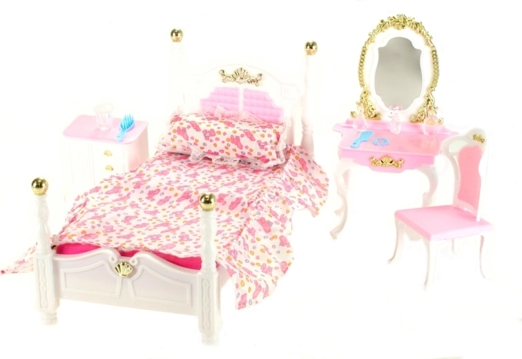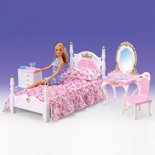 A Glorie Hálószoba tartalmaz egy műanyag ágyat kb. 16 cm × 34 cm × 18 cm méretben ágytakaróval és párnával, egy fésülködőasztalt kb. 13 cm × 8 cm × 22 cm méretben kiegészítőkkel babákhoz – fésű, karkötő, kefe és üvegcsék –, egy fotelt kb. 7 cm × 7 cm × 13 cm, valamint egy éjjeliszekrényt kb. 8,5 cm × 6 cm × 8 cm méretben. A baba nem része a csomagnak. Ajánlott életkor: 3+