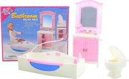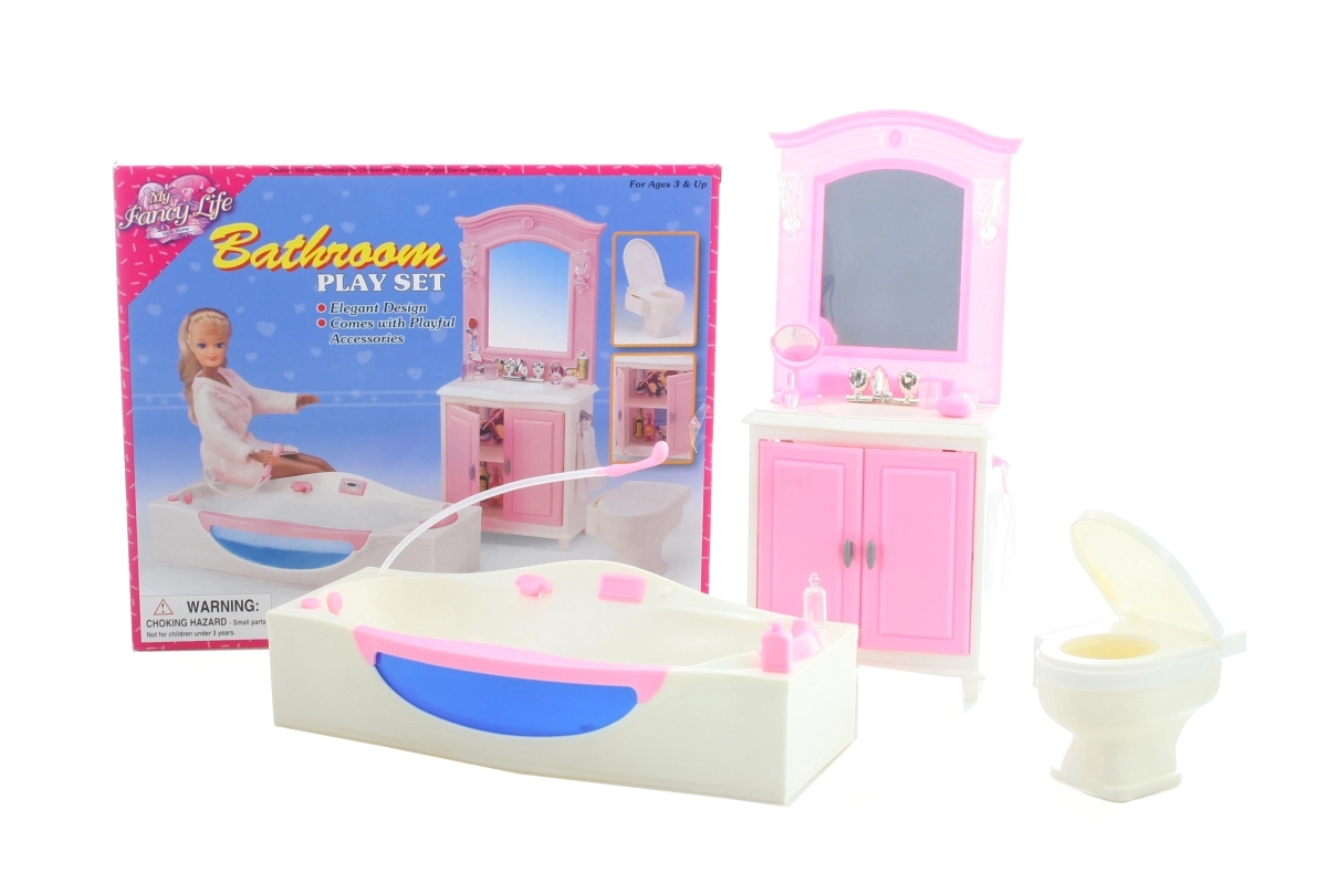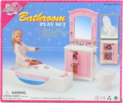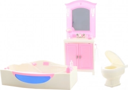 A csomag tartalma a fésülködőasztal mosdóval, a kád és a WC, valamint apró kiegészítők, amelyek valódi fürdőszobai hangulatot teremtenek. A műanyag kivitel könnyű tisztítást és hosszú élettartamot biztosít a mindennapi játék során.