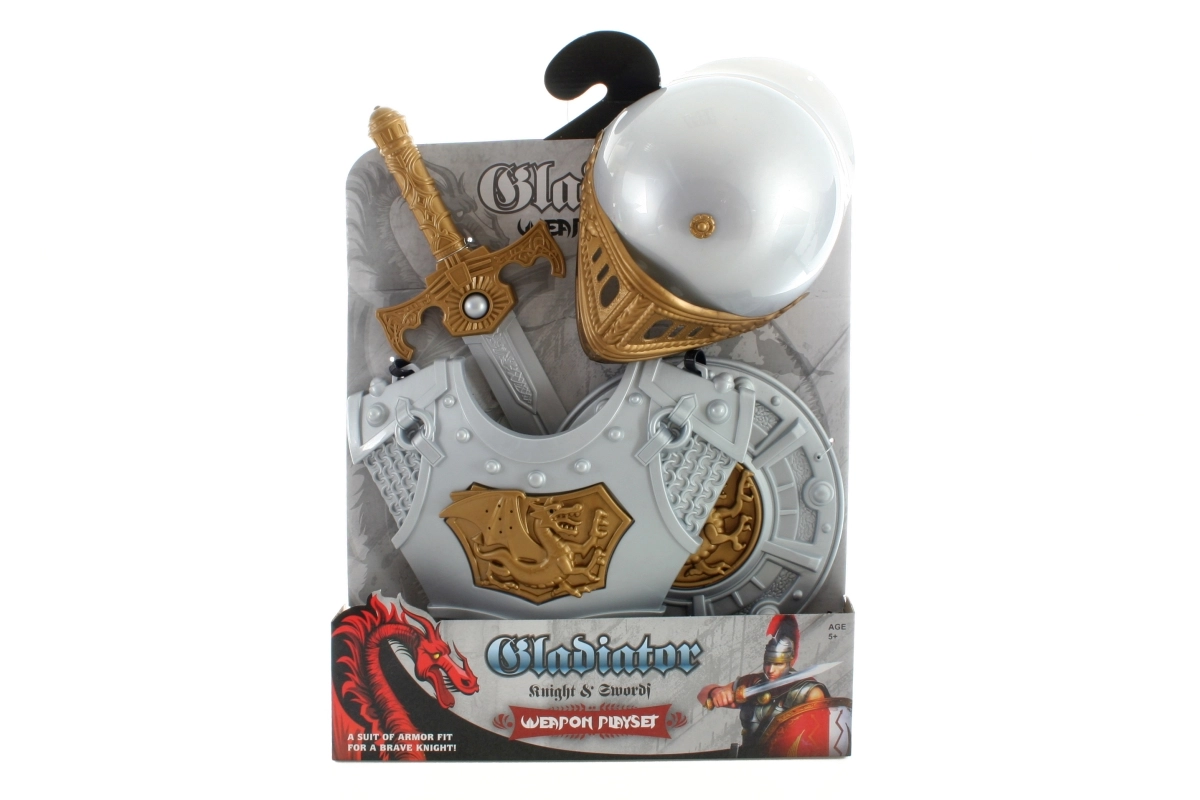 A készlet része egy dekoratív kard és pajzs, amelyet mellvért és sisak egészít ki az autentikus megjelenésért. A szett kényelmes viseletre és könnyű felvételre készült, ezért jelmezekhez, farsangra és szabad játékhoz is remek választás.