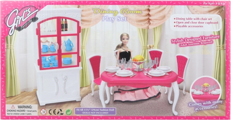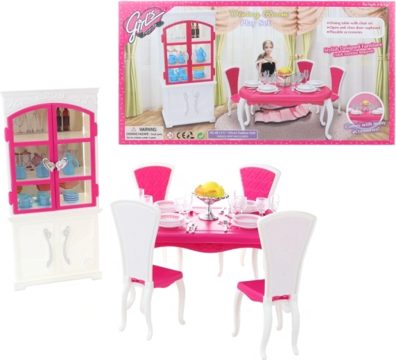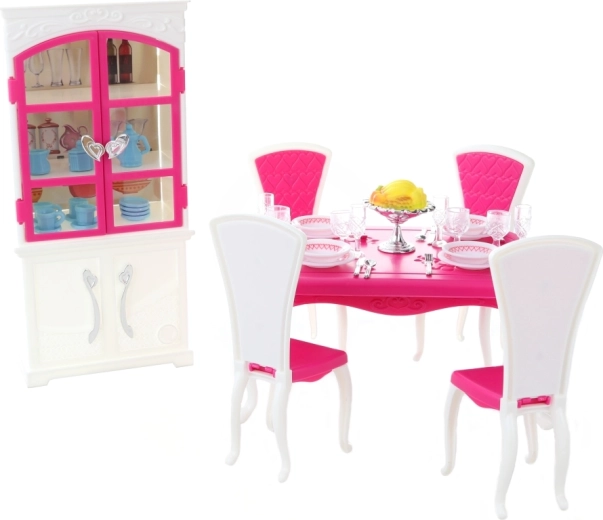 A Glorie babakonyhai étkezőszett teljes körű étkezési élményt kínál elegáns műanyag asztallal, négy székkel és szekrénnyel, kiegészítve tányérokkal, poharakkal, evőeszközökkel és dekoratív kiegészítőkkel.