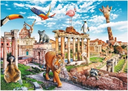 Az egyedi illusztráció a római látnivalókat egzotikus állatokkal ötvözi. A szórakoztató, részletgazdag kép leköti a figyelmet, és az egész család élvezheti az összerakást.