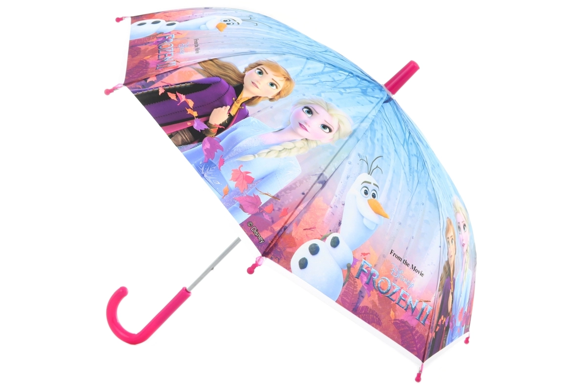 Manuális esernyő Frozen motívumokkal. A kinyitott esernyő méretei kb. 64 x 64 x 60 cm. A csomagolás méretei kb. 60 x 8,5 x 4 cm. Műanyag tasakban csomagolva.