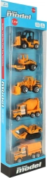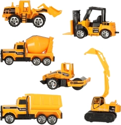 - Teljes, 6 darabos készlet – betonkeverő, targonca, kotrógép, buldózer, billenőplatós, úthenger
