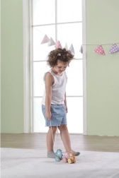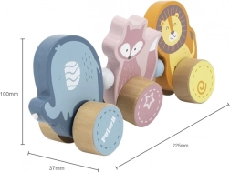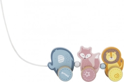 Ez a minőségi, fa húzható játék lágy pasztell árnyalatokban készült, kifejezetten azoknak a kicsiknek, akik épp járni tanulnak és felfedezik a világot. A három bájos állat – elefánt, róka és oroszlán – össze van kapcsolva, és simán gurul a fa kerekeken. A masszív húzózsinórnak köszönhetően a játékok könnyen vezethetők, mozgásra motiválnak, és természetes módon fejlesztik az egyensúlyt és a koordinációt.