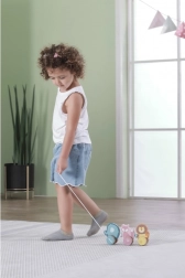 A játék tartós, lakkozott fából készül, és nem mérgező festékekkel van színezve, amelyek biztonságosak a gyermekek számára. A sima élek és a kellemes méret ideálisak a kis gyerek kezekhez. Közös és önálló játék közben a gyerekek fejlesztik a kreativitást, a finommotorikát és a képzelőerőt.