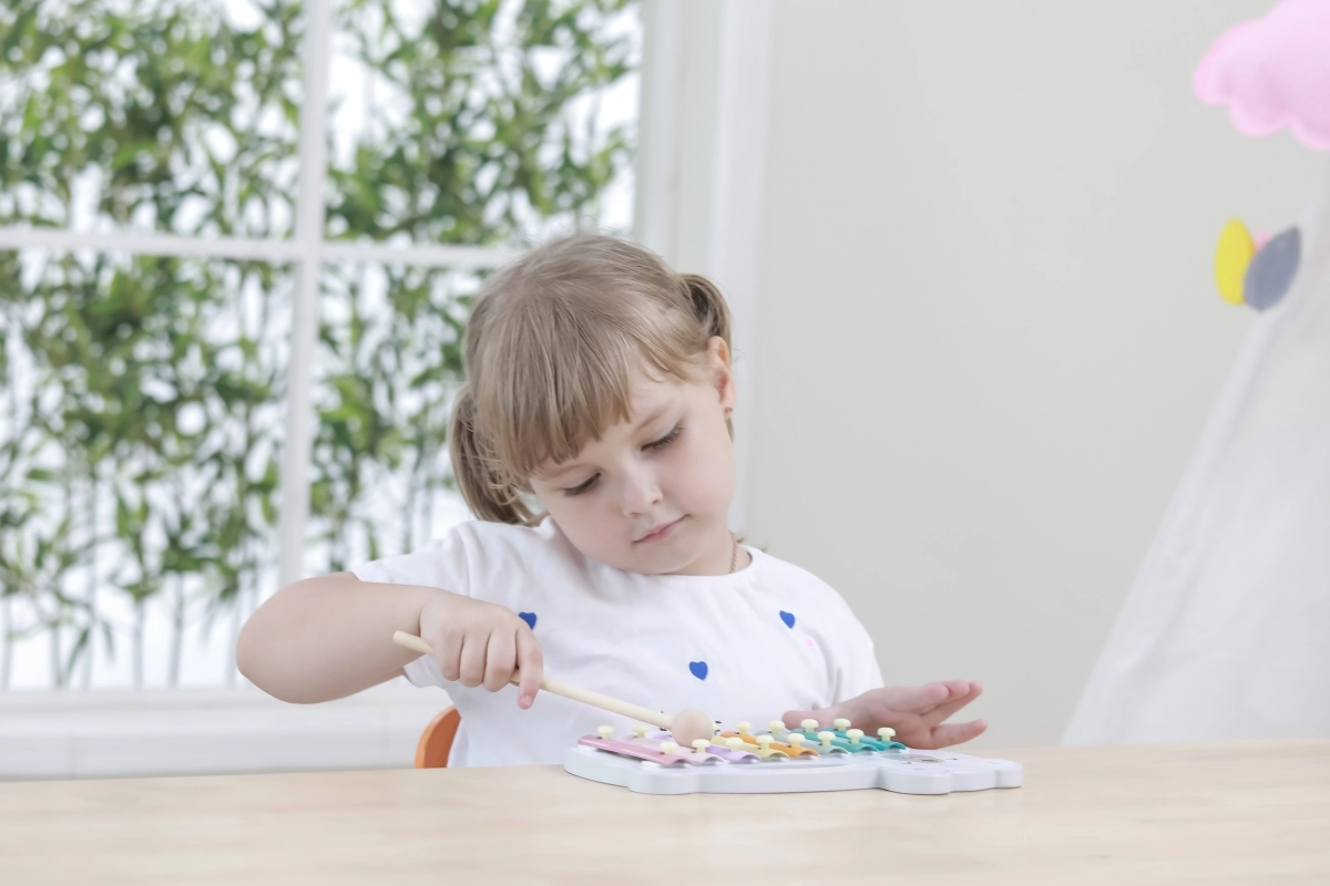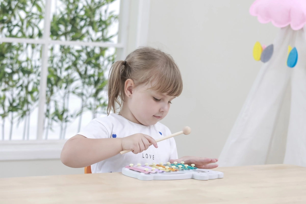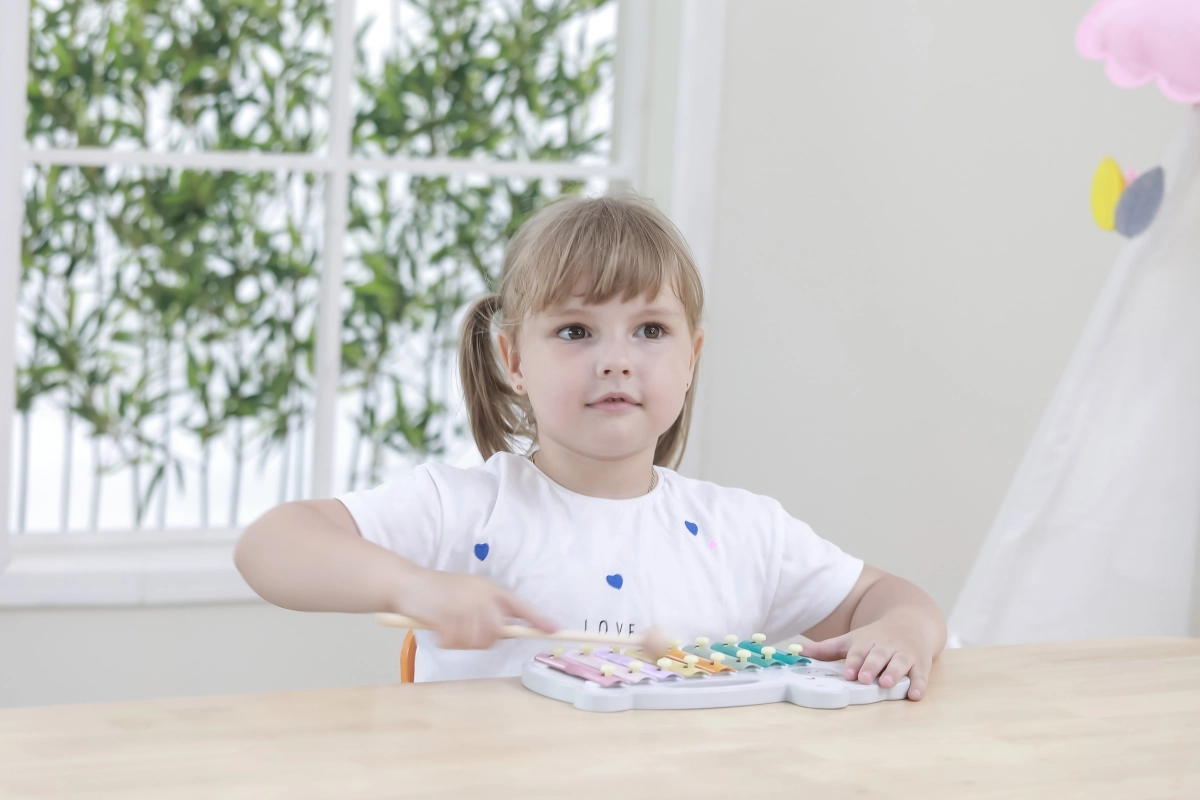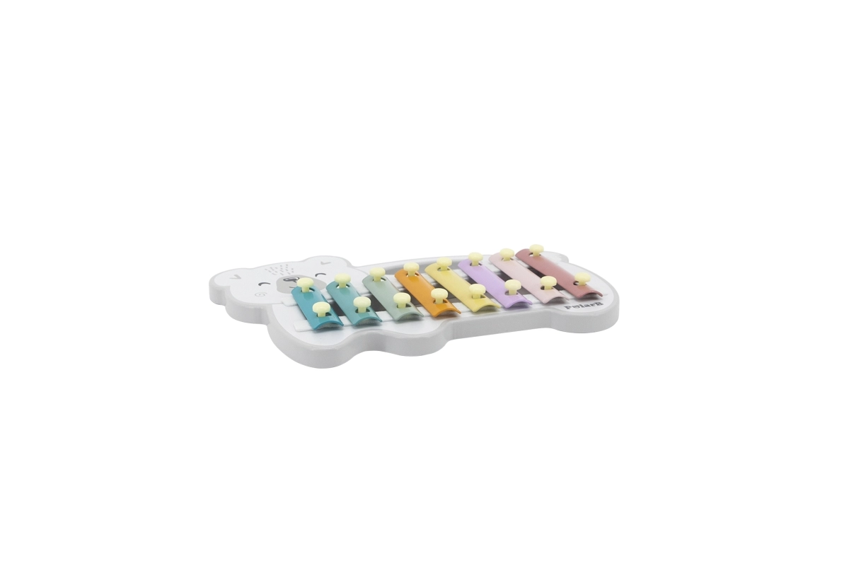 Nyolc pasztellszínű billentyű motiválja a gyerekeket a hangok, a ritmus és az egyszerű dallamok felfedezésére. Tökéletes a hallási észlelés és a kreativitás fejlesztéséhez.