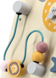 A elülső panel különböző tevékenységeket tartalmaz, amelyek ösztönzik a gyermek kreativitását és tanulását.