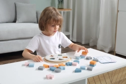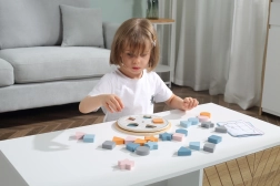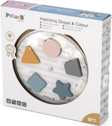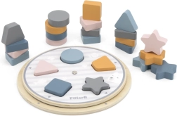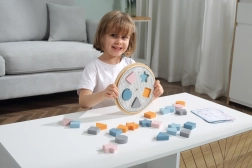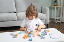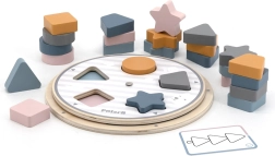 A gyerekek a fa elemeket a tábla kivágásaihoz párosítják, miközben természetes módon sajátítják el a színeket és az alapformákat – kört, négyzetet, háromszöget és csillagot.