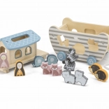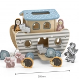 Ez a minőségi fa Noé bárkája több játékelemet ötvöz egy okos játékban: a gyerekek a megfelelő nyílásokba illesztik az állatokat, a kis hajót zsinóron húzzák, és saját történeteket találnak ki. A stabil kivitel és a kellemes színek segítik a koncentrációt és fejlesztik a fantáziát.