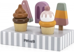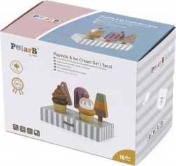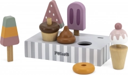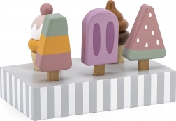 Az 5 fa jégkrémből álló, csábító színű készlet végtelen szórakozást kínál a gyerekeknek. A jégkrémek egy stabil fa állványon kapnak helyet, amely kiállításra és áttekinthető tárolásra is szolgál. Minden minőségi fából készült, biztonságos, nem mérgező festékekkel színezve.