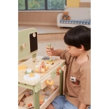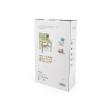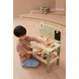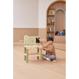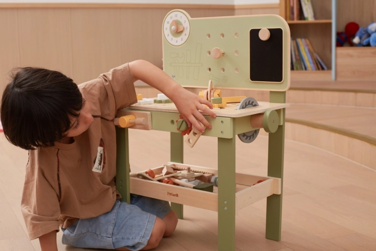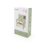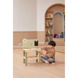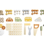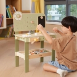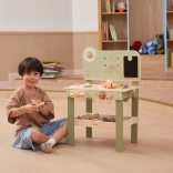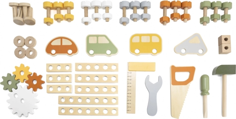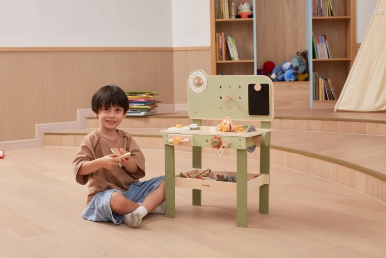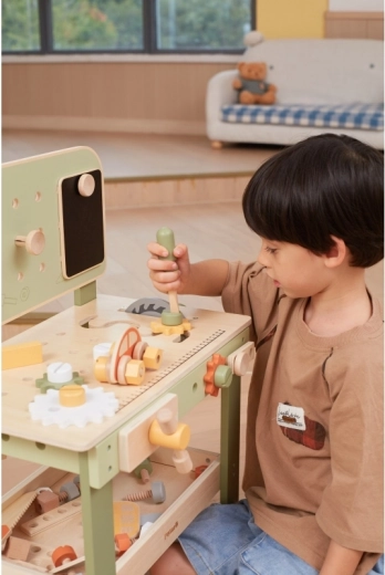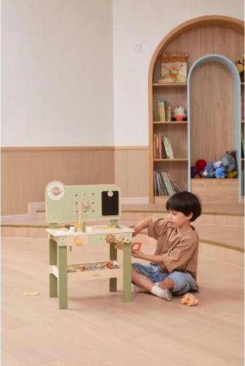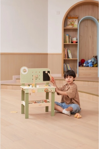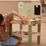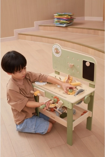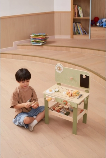 Stílusos gyerek munkapad természetes–zöld színösszeállításban, amely valósághű műhelyélményt nyújt biztonságos, fából készült formában. A gyerekek csavarozhatnak, kereket cserélhetnek az autócskán, „vághatnak” elemeket, összeállíthatják a fogaskerekeket, és felfedezhetik az ok-okozati összefüggéseket. Az áttekinthető tárolómegoldásnak köszönhetően minden alkatrész és szerszám mindig kéznél van.