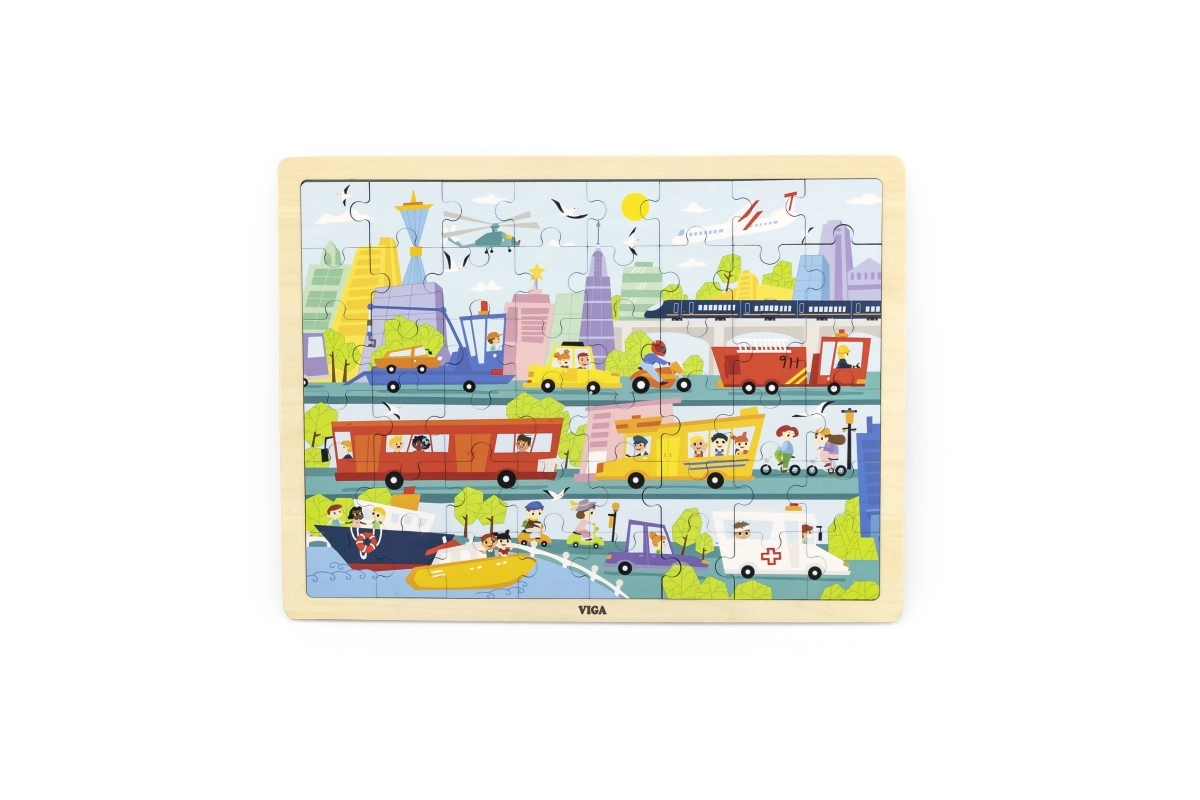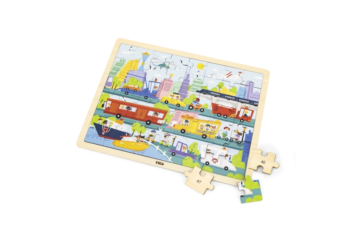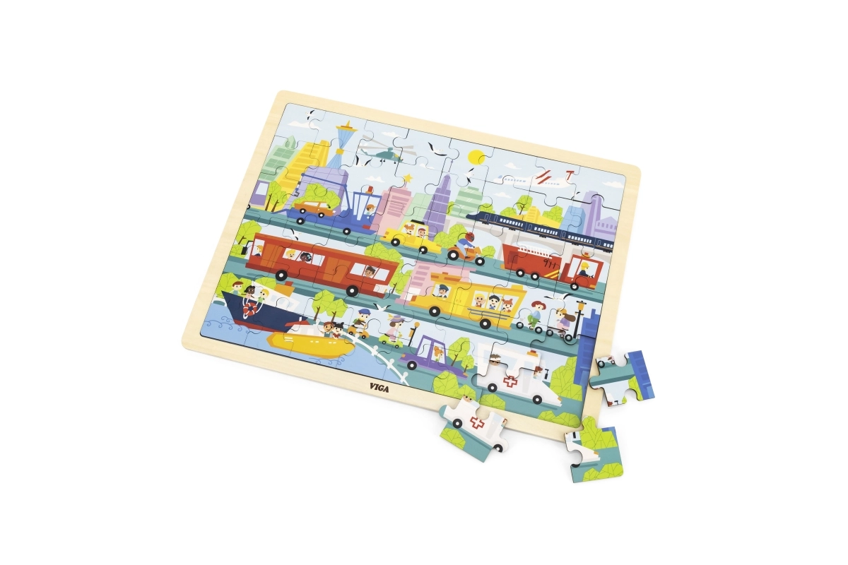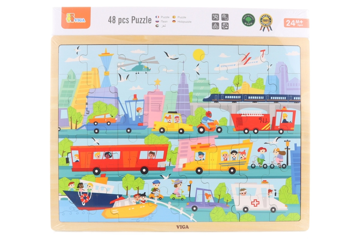 Ez a minőségi, fa puzzle a város és a közlekedési eszközök színes jeleneteivel elbűvöli a kis felfedezőket. A 48 darabnak és a masszív keretnek köszönhetően a gyerekek gyakorolják a koncentrációt, a szem–kéz koordinációt és a türelmet. A világos színek és az egyértelmű illusztrációk motiválnak az ismételt kirakásra.