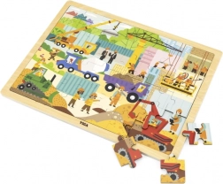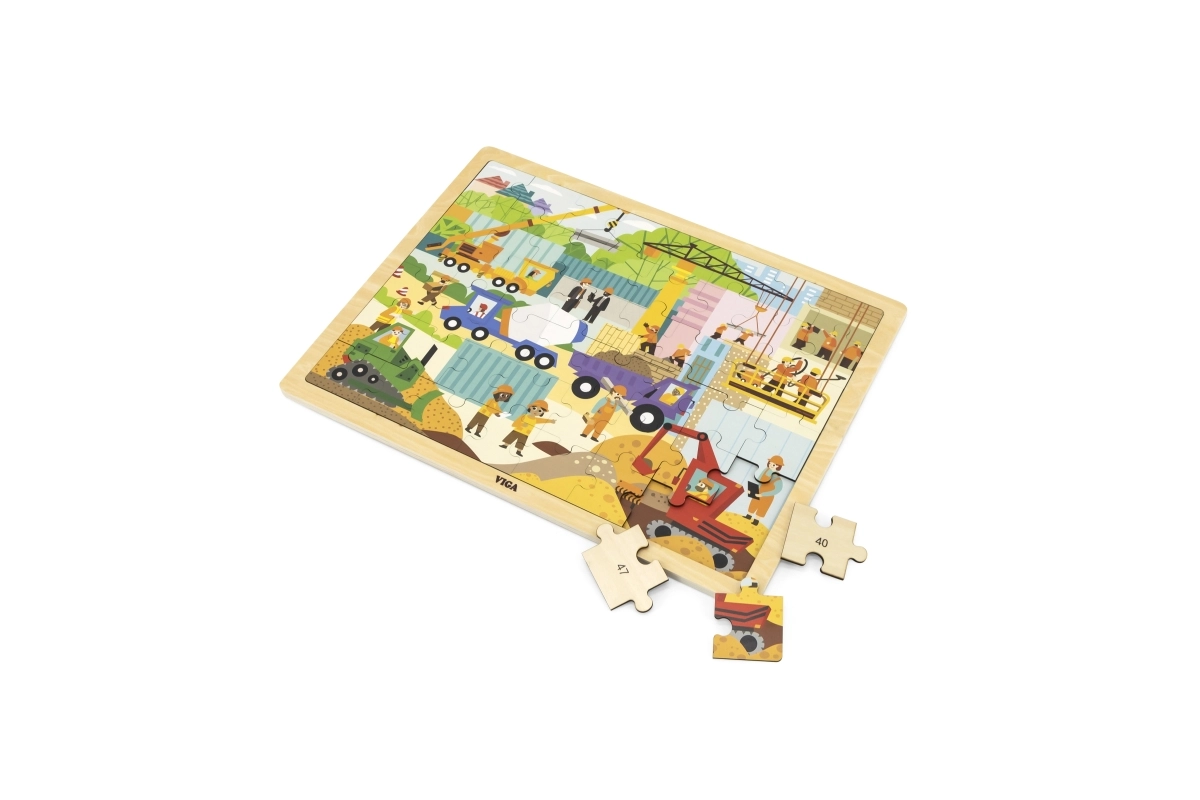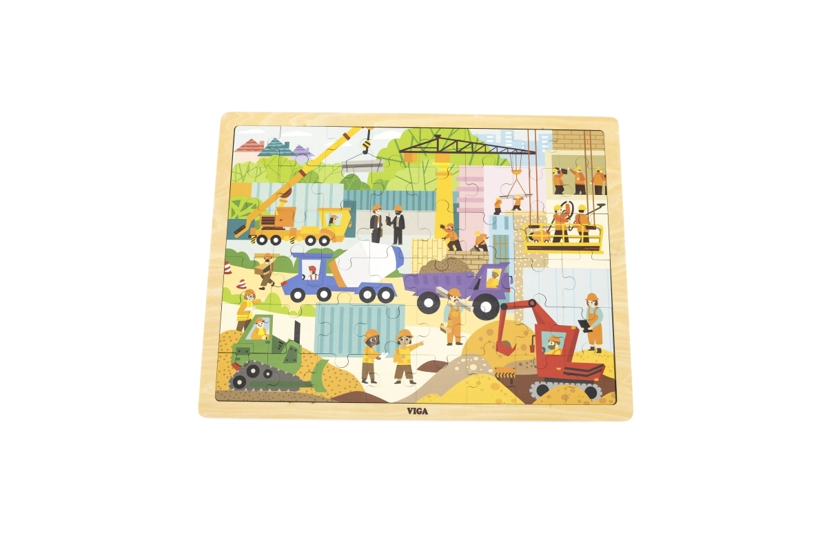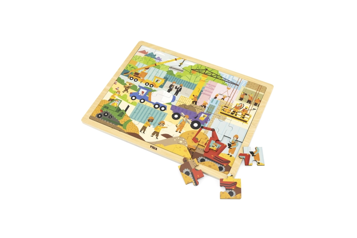 A 40 × 30 cm-es nagy kép tele van részletekkel – építőgépek, munkások és közlekedési táblák kötik le a figyelmet és motiválnak az újbóli kirakásra. A puzzle 24 hónapos kortól ajánlott, segít fejleszteni a türelmet, a koncentrációt és a térbeli észlelést.