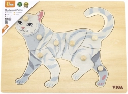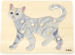 A gyermek feladata, hogy a macska képét ne csak az illusztráció, hanem az egyes elemek formája alapján is kirakja. Gombfogantyúk könnyítik meg a megfogást az apró ujjaknak, és segítik a kéz helyes vezetését. A masszív fa alaplap biztosan a helyén tartja az elemeket, és ellenáll a mindennapos használatnak.