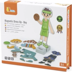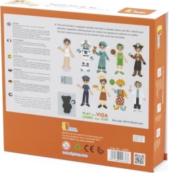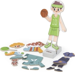 Ez a minőségi, fából készült játék a VIGA márkától szórakoztató, mágneses fiúfigura-öltöztetést kínál. A különféle ruháknak és kiegészítőknek köszönhetően a gyerekek könnyedén hoznak létre egyedi szetteket, ügyesítik ujjaikat, és megtanulják kombinálni a színeket és stílusokat.