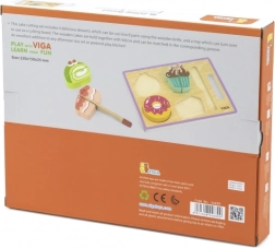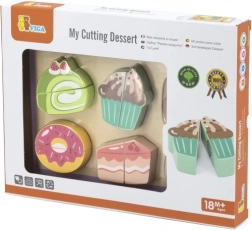Fedezd fel a kreatív játékot a VIGA My Cutting Dessert fa készlettel. A négy színes desszert a tépőzáras kapcsolódásnak köszönhetően biztonságosan „vágható” a fa késsel 8 részre és újra összerakható. A tálca könnyen megfordítható és vágódeszkaként használható, ami támogatja a hiteles játékot a gyerekkonyhában.
