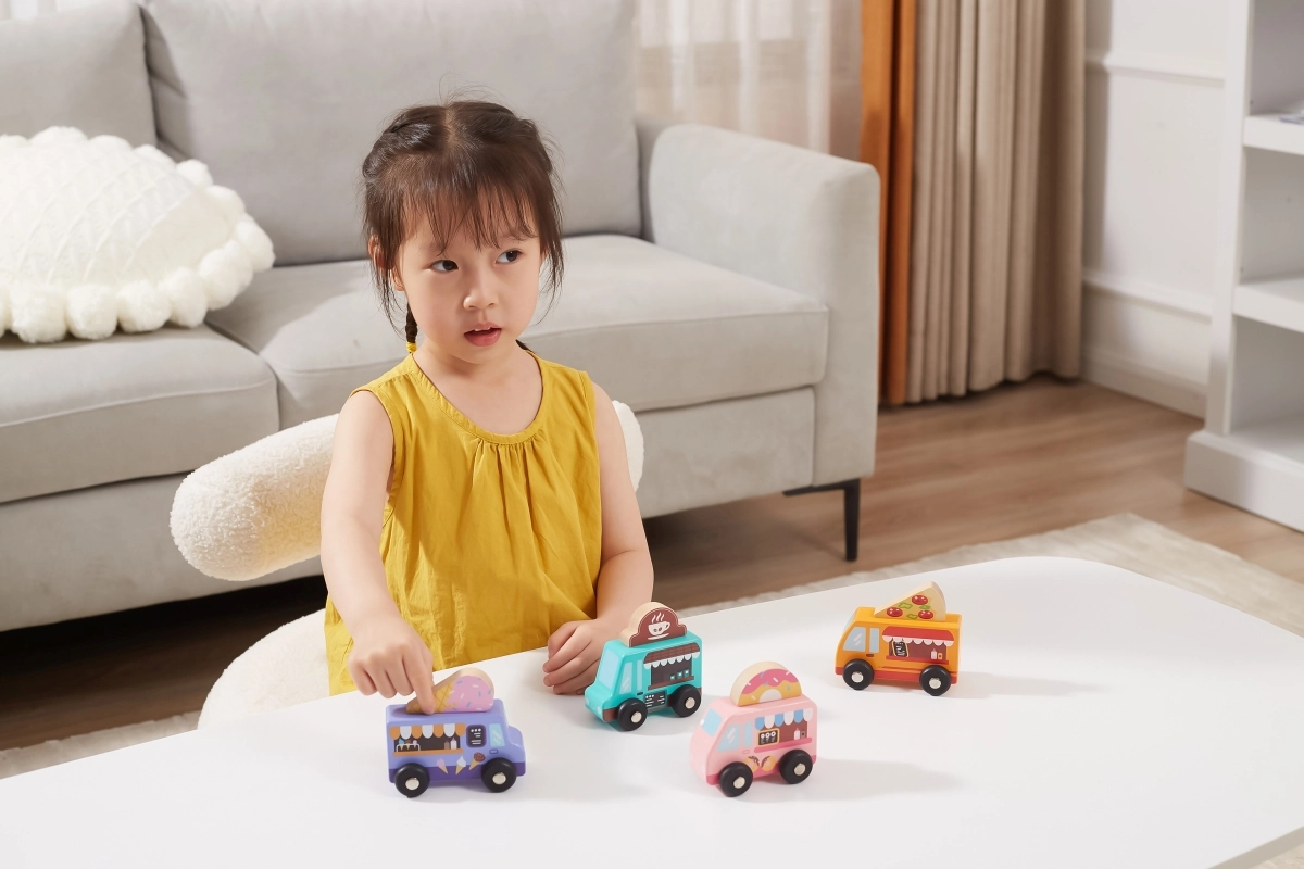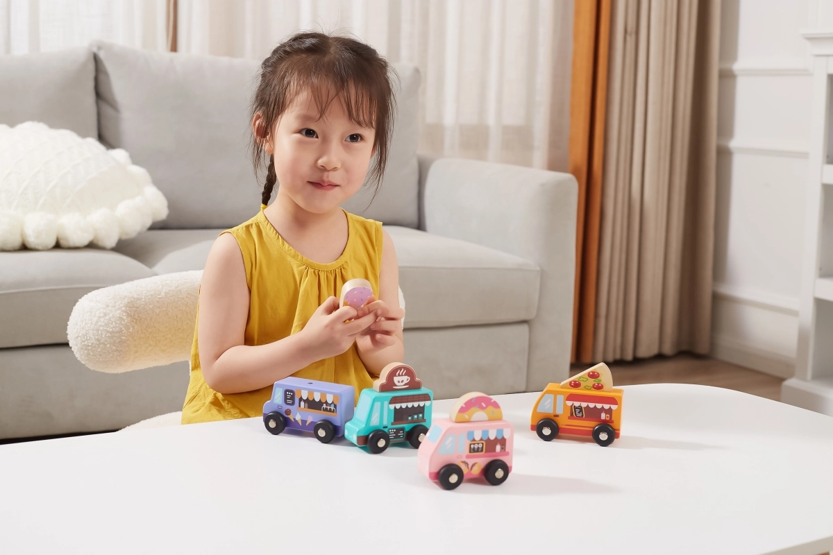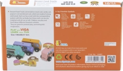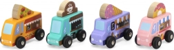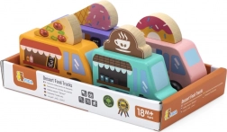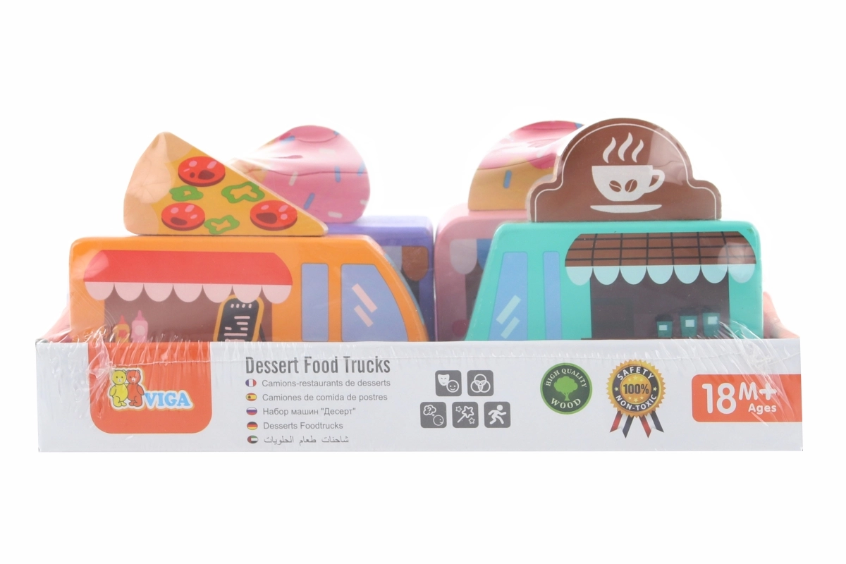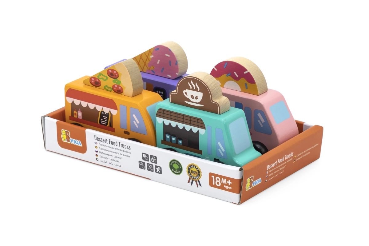 A Viga fa food truck készlet négy bájos, kerekeken guruló járművet tartalmaz pasztellszínekben, részletgazdag nyomatokkal. Minden truckhoz tartozik egy tematikus banner – pizza, kávé, fagylalt és fánk –, amelyek tetszés szerint felcserélhetők, így a gyerekek saját történeteket és üzleteket alkothatnak. A minőségi fa és a nem mérgező festékek biztonságos és tartós szórakozást garantálnak.