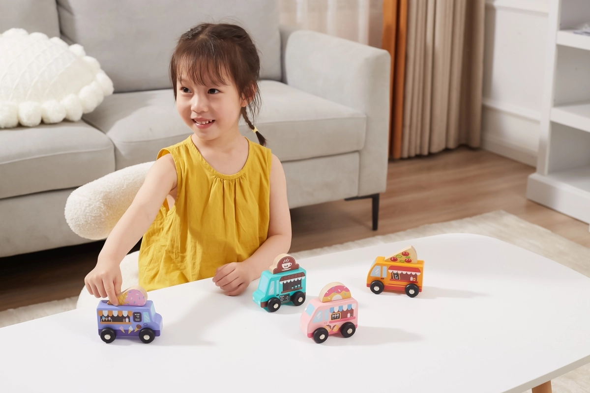 A felső táblák pizza, kávé, fagylalt és fánk motívumokkal könnyedén felcserélhetők. A gyerekek így saját food truckot állíthatnak össze, és fejleszthetik a szerepjátékot.