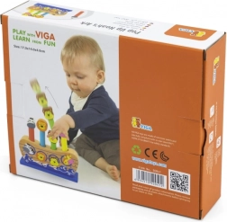 Viga fa ugráló állatkák élénk színeivel és vidám figuráival – zsiráf, majom, oroszlán és zebra – minden gyermeket felvidít. Elég megnyomni a fejüket, és az állatkák Noé bárkájából felpattannak – a játék szórakoztató módon fejleszti a kéz–szem koordinációt, a színek tanulását és az állatok felismerését. A biztonságos, minőségi fa kivitel és a nem mérgező festékek gondtalan, örömteli játékot garantálnak.