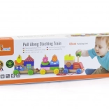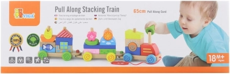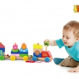 Ez a minőségi, húzós fa mozdony három vagonnal számos lehetőséget kínál a színes formák rakosgatására és átrendezésére. A gyerekek gyakorolhatják a szem–kéz koordinációt, megismerhetik a színeket és formákat, miközben élvezik a vonat húzogatását a lakásban.