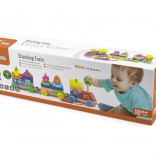 A masszív kivitelezés, a sima élek és a biztonságos festékek hosszú élettartamot és biztonságos játékot garantálnak. A készlet ideális első fa építőkészletnek a kis vonatrajongók számára.
