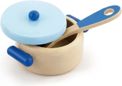 Teljes felszerelés a főzős játékhoz: fedeles lábos, serpenyő tojással, kanál, sótartó, borsszóró és textil edényfogó. Ideális az első konyhai kalandokhoz.