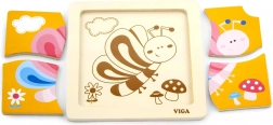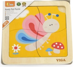 Első kirakó a legkisebbeknek: a VIGA fa puzzle pillangó motívummal 4 nagy darabból áll, amelyeket könnyű megfogni, és egy fa keretes tálcába, mintával lehet illeszteni. Fejleszti a finommotorikát, a kéz–szem koordinációt és a logikus gondolkodást, ideális 18 hónapos kortól.