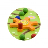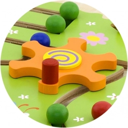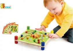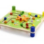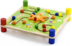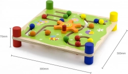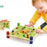 A játék segíti a gyerekeket a kézügyesség és a szem-kéz koordináció fejlesztésében, miközben a színes csapokat a táblára helyezik.