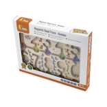 Minden számhoz egy-egy állatkép és a hozzátartozó gyöngyszám tartozik, például 1 tehén, 2 kutya, 3 bárány stb. A tábla mágneses tollal van ellátva, amely lehetővé teszi a gyöngyök mozgatását. Ideális 18 hónapos kortól.