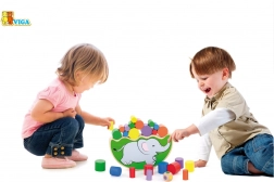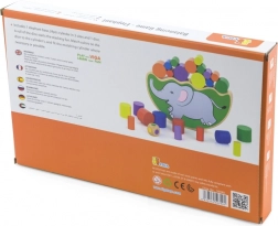 A domború elefánt-alap és a különböző méretű hengerek segítik a gyerekeket az érzékeny egyensúlyozásban és a pontos pakolásban.