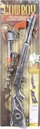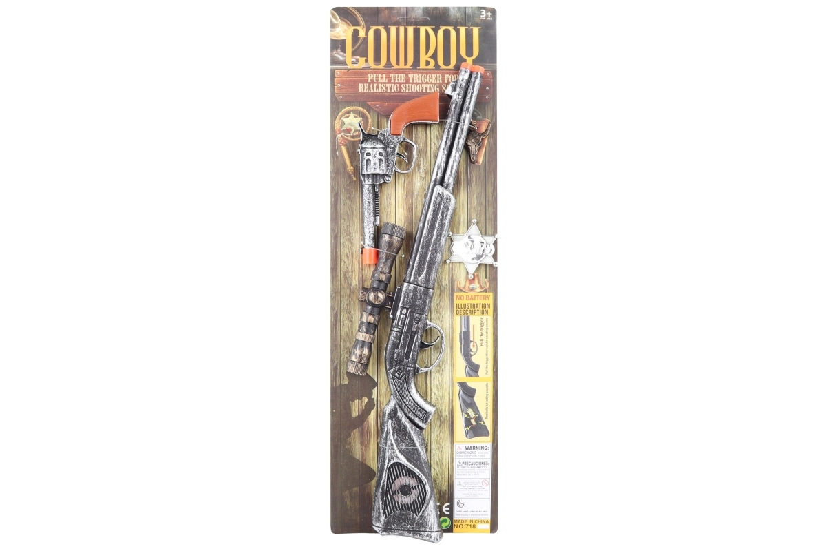 Ez a szórakoztató kovboj készlet autentikus vadnyugati élményt nyújt a gyerekeknek. A kb. 50 cm hosszú nagy puska irányzékkal felszerelt, a pisztoly kényelmes fogású, és a lövés hanghatás még valóságosabbá teszi a játékot – mindezt elemek nélkül.