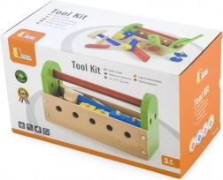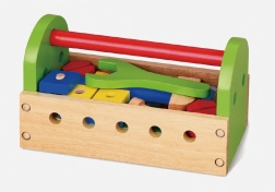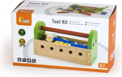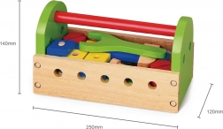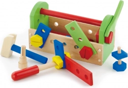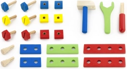 Szórakoztató és biztonságos fa szerszámkészlet 3 éves kortól, praktikus hordozóban. Tartalmaz csavarhúzót, kalapácsot, villáskulcsot és színes csavarokat, anyákat és lapocskákat csavarozáshoz. Minőségi fából készült kivitelének köszönhetően fejleszti a finommotorikát, a koordinációt és a fantáziát.