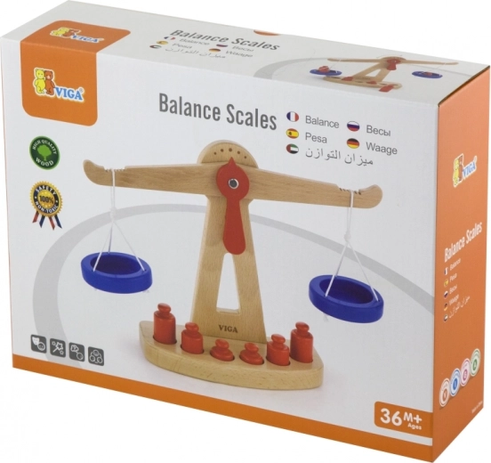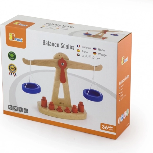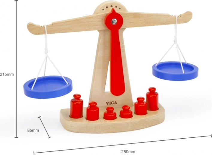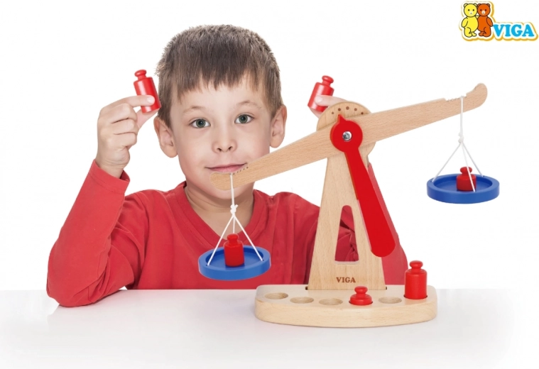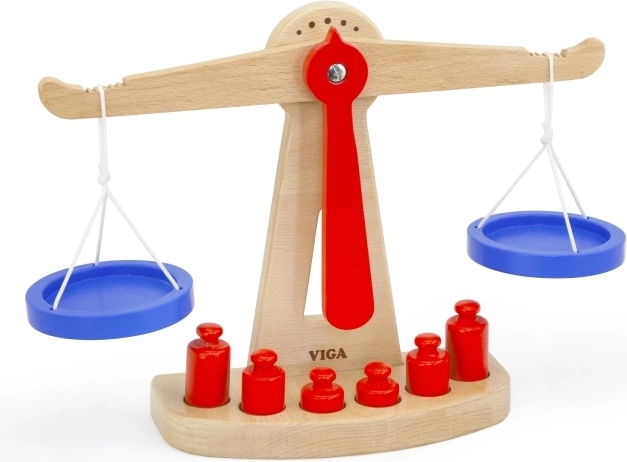 A Viga fa egyensúlyi mérlege két, zsinóron függő kék tállal rendelkezik, és hat, különböző méretű piros súlyt tartalmaz. Színes kialakításának és biztonságos felületkezelésének köszönhetően rengeteg szórakozást nyújt a gyerekeknek. Úgy tervezték, hogy ösztönözze a gyerekeket a képzelet és a fantázia használatára a boltos szerepjáték során, ami segít megérteni a alapvető matematikai fogalmakat és az egyensúly értékét.