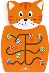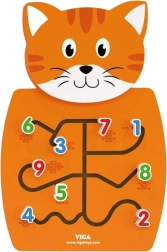 Fából készült macska labirintusokkal, a számok mozgatásához és a finommotorika fejlesztéséhez.