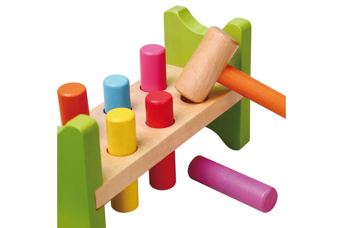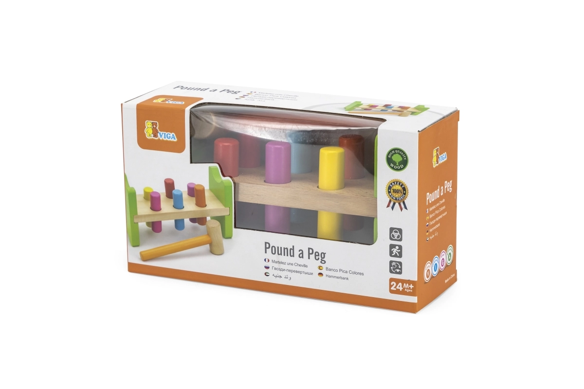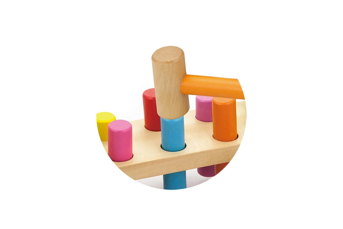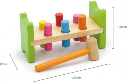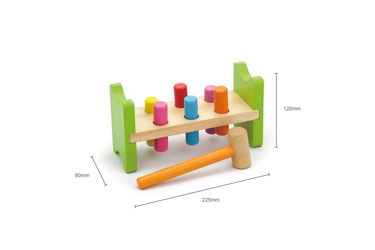Ez a fa kalapálós játék kb. 22,5 × 12 × 7,7 cm-es méretével órákon át tartó, értelmes elfoglaltságot kínál a gyerekeknek. A színes pöcköket fa kalapáccsal lehet beütni, így a gyerekek természetes módon fejlesztik a fogóerőt, a mozdulatok pontosságát és a logikus gondolkodást. A tartós kialakítás és a sima felületek biztonságos használatot biztosítanak.