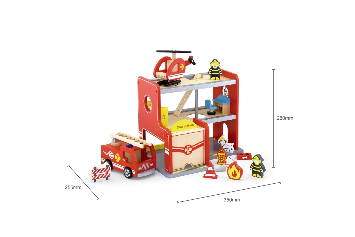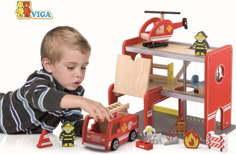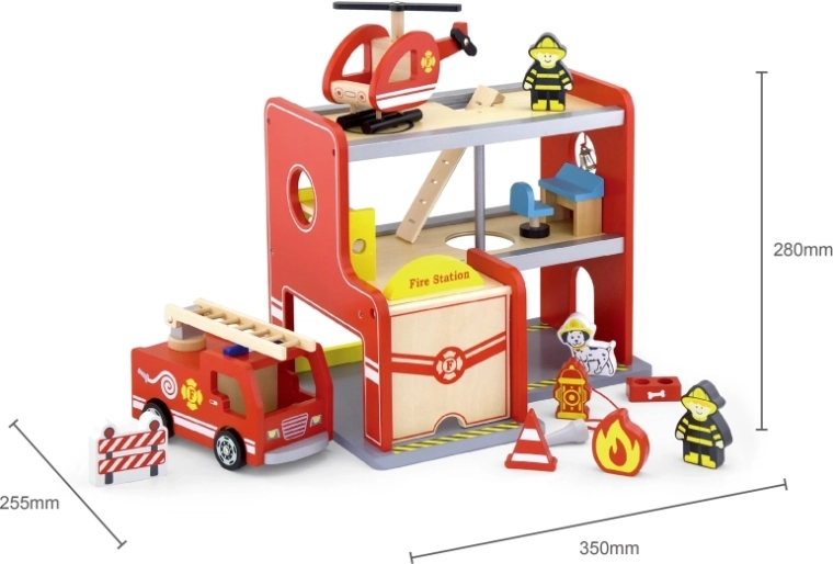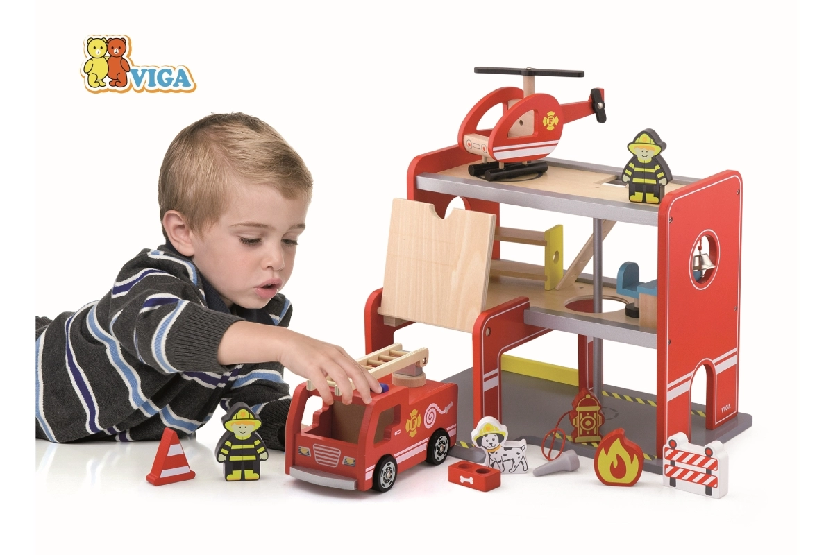 A Viga fa tűzoltóállomás egy komplett, többszintes játékkészlet, amely támogatja a szerepjátékot, a finommotorika és a képzelet fejlődését. A gyerekek kigurulhatnak az autóval a garázsból, a felső platformon leszállhatnak a helikopterrel, és a csúszócsövön suhanhatnak közvetlenül a bevetésre. A színes részletek és a minőségi fa szerkezet vonzó megjelenést és tartósságot biztosít a mindennapos használathoz.