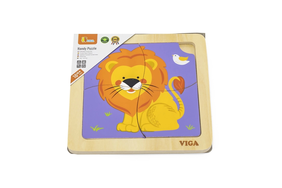 Ez a minőségi, fából készült, vidám oroszlános puzzle a kis kezekhez lett tervezve. A négy robusztus, sima élű darabnak köszönhetően a gyerekek könnyen tanulják a formák párosítását, miközben türelmüket és figyelmüket is gyakorolják. A praktikus faalap a helyén tartja a darabokat és megkönnyíti az összerakást.