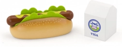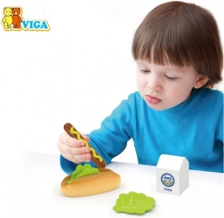 Ez a minőségi VIGA fa készlet élethű főzős játékot kínál a gyerekeknek. A zsemlével, salátával és mustárral kiegészített hot dog, valamint a „tejesdoboz” fejleszti a kreativitást és megtanítja a társas játék alapjait. Masszív fa kivitelének köszönhetően ideális a mindennapos játékhoz.