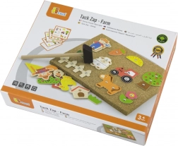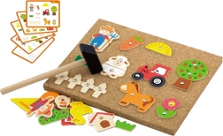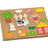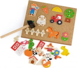 A színes fa alakzatok rajzszögekkel rögzíthetők a masszív parafatáblára – a gyerekek állatokat, traktort és farmert rakhatnak ki fantáziájuk szerint.