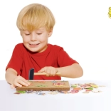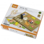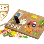 Ez a fa Montessori játék támogatja az önálló felfedezést és a koncentrációt. Az előfúrt lyukú elemek a rajzszögek segítségével könnyen rögzíthetők a masszív parafatáblára, így a gyerekek újra és újra összeállíthatnak traktorokat, állatokat és farmert.
