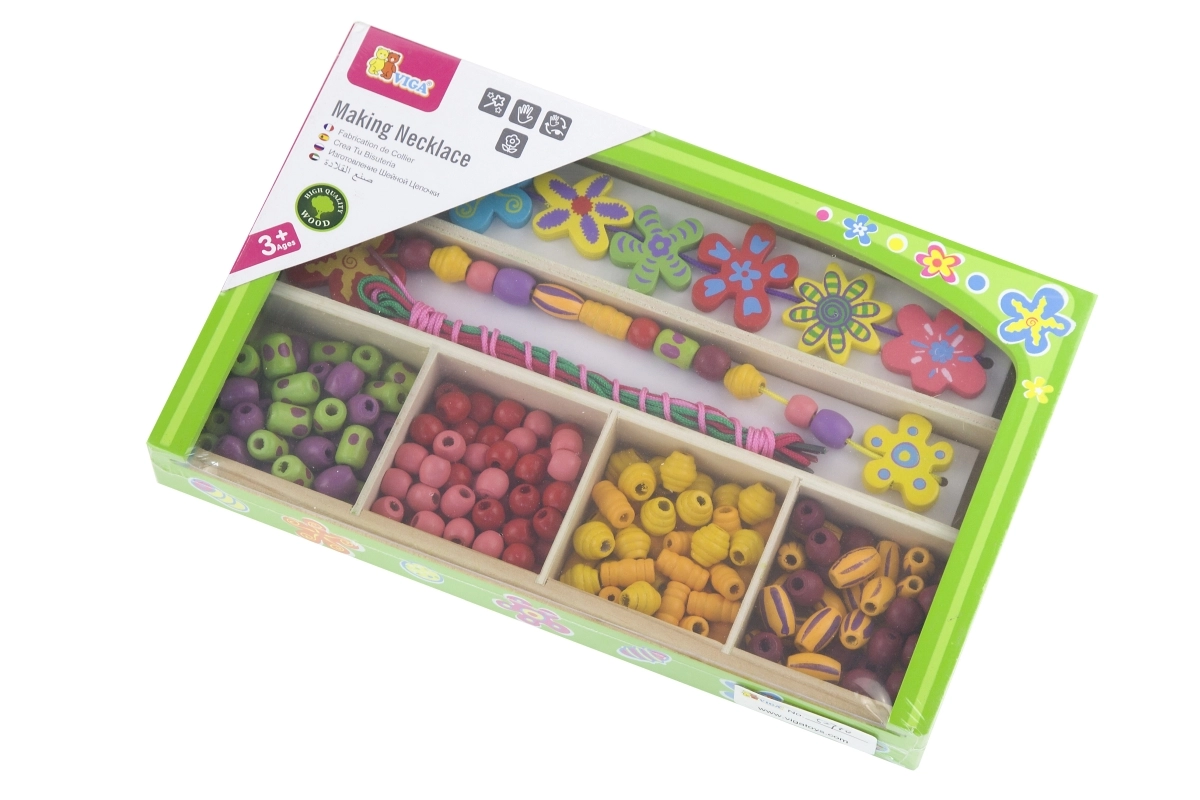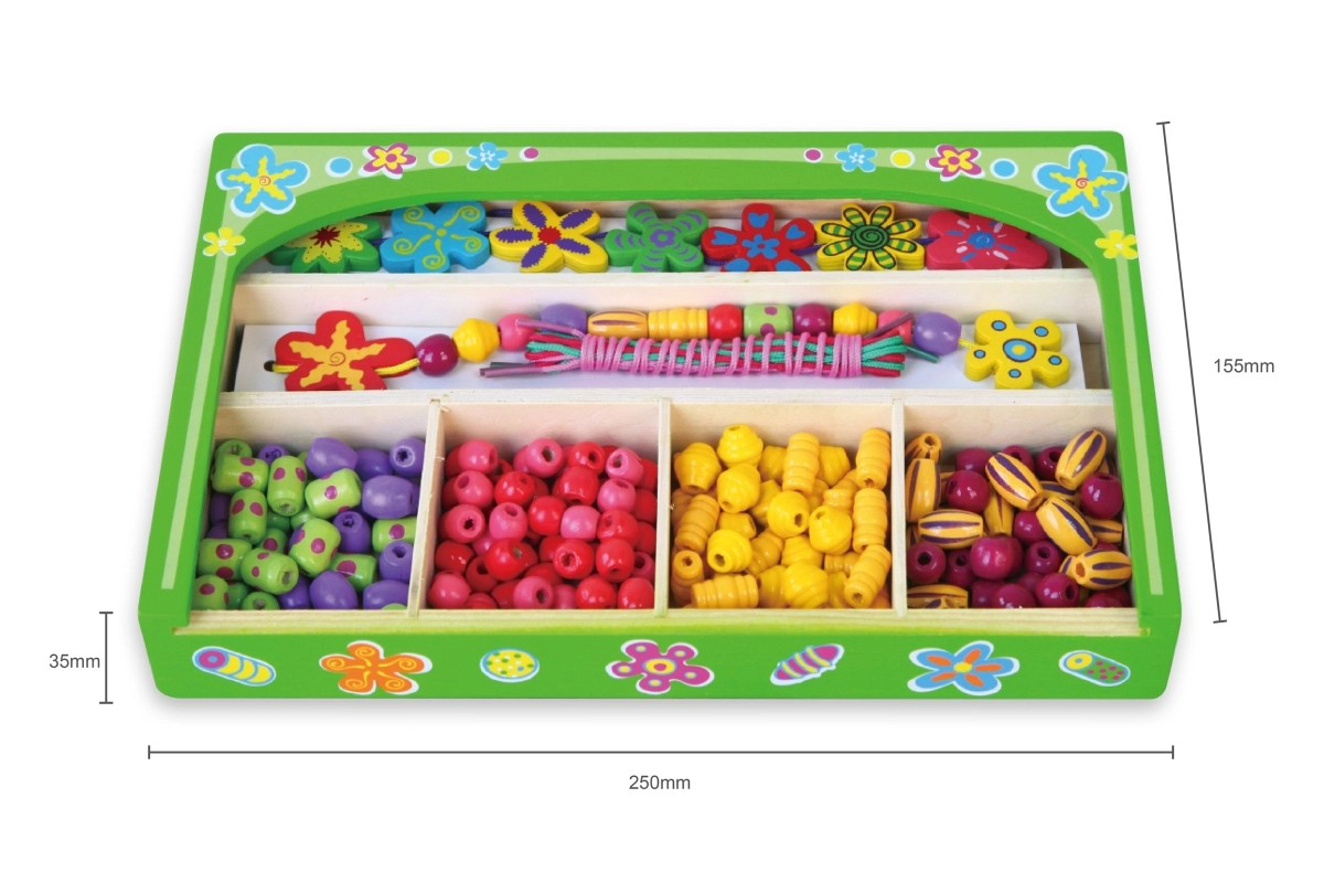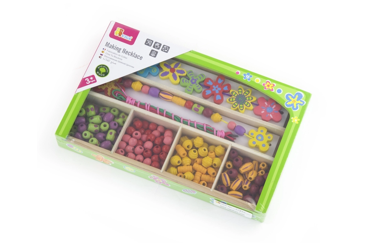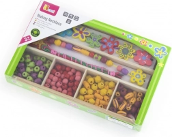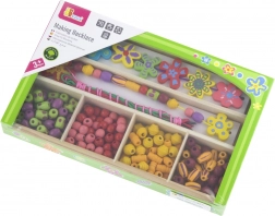 Ez a fa gyöngykészlet órákon át tartó szórakozást nyújt a gyerekeknek egyedi nyakláncok és karkötők készítése közben. A dobozban különböző alakú és méretű, színes gyöngyök, virágos díszek és zsinórok találhatók az egyszerű fűzéshez. Az áttekinthető rekeszeknek köszönhetően a gyöngyválasztás könnyű, a kreatív alkotás pedig természetes módon támogatja a koncentrációt és az önkifejezést.
