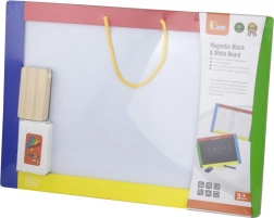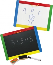 Praktikus kétoldalas, mágneses fa tábla 42 × 30 cm méretben, fekete, krétás és fehér, szárazon törölhető felülettel; a csomagban 4 kréta, egy filctoll és egy szivacs található – ideális 3 éves kortól a kreativitás fejlesztéséhez.