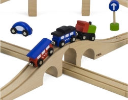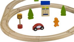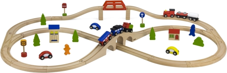Építsétek meg a saját sínvilágotokat! A fa vonatpálya a pályák teljes hosszával és elrendezésével lehetővé teszi változatos útvonalak építését, hidak leküzdését, valamint a közlekedés és a város összekapcsolását a mellékelt kisautók és kiegészítők segítségével. A minőségi fa kivitel tartós és kellemes fogású.