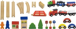 - Sínek, 2 × mozdony, 4 × vagon, 3 × kisautó, kiegészítők (táblák, fák, házikók stb.)