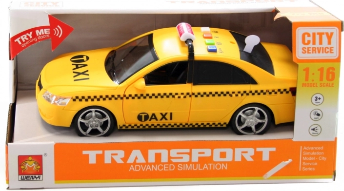 Szórakoztató műanyag taxi 3 éves kortól, fényhatásokkal, valósághű hangokkal és nyitható ajtókkal. Tápellátását 3× AG13 elem biztosítja, amelyek a csomag tartozékai. Ideális játék a fantázia fejlesztéséhez és városi szerepjátékokhoz.